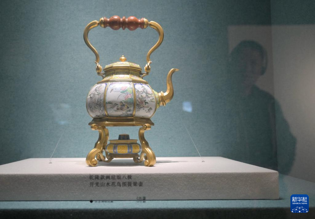 这是12月30日在特展现场拍摄的清代乾隆款画珐琅八棱开光山水花鸟图提梁壶。新华社记者 林善传 摄