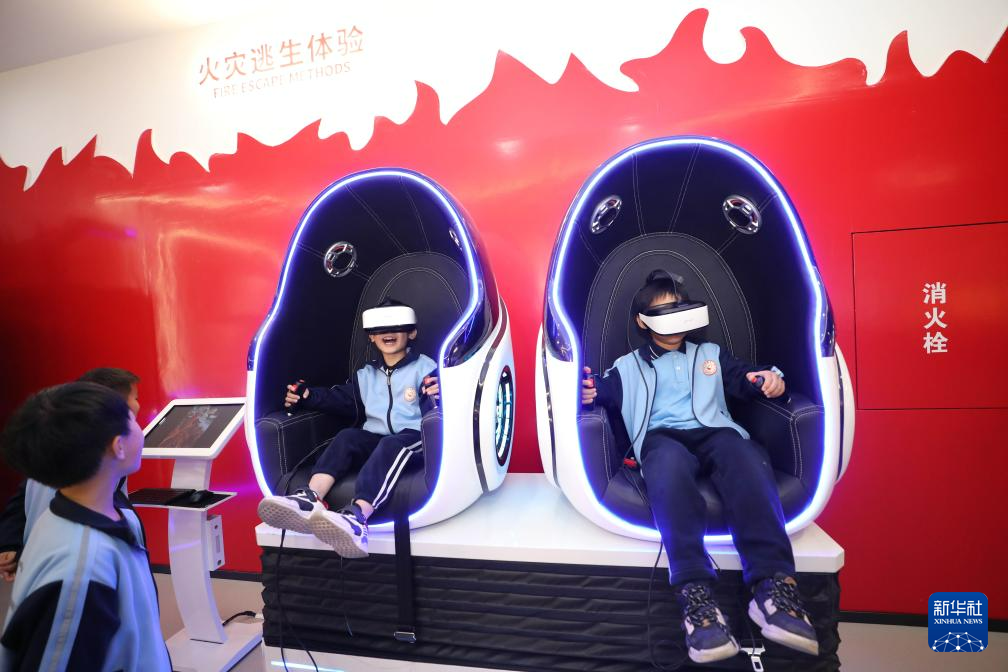 1月6日,在福建省厦门市消防科技教育馆,厦门市槟榔小学学生通过消防VR设备体验火灾逃生。 新华社发(曾德猛 摄)