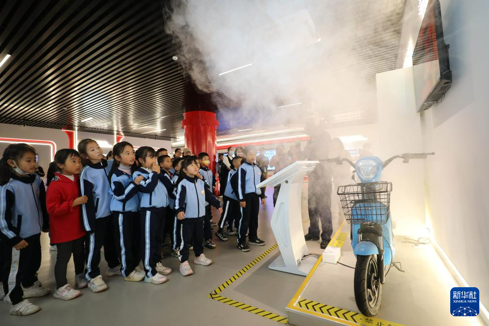 1月6日,在福建省厦门市消防科技教育馆,厦门市槟榔小学学生观摩电动自行车火灾实验。