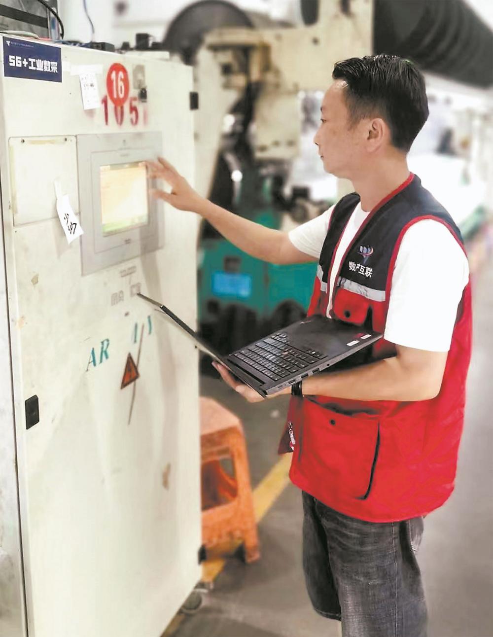 目前长乐已经有600多家纺织企业的8956台设备接入了“AI数采终端”,打破了每台纺织机械都是“信息孤岛”的局面。图为福州数产公司技术人员对长乐一家纺织企业的接入设备进行调试。