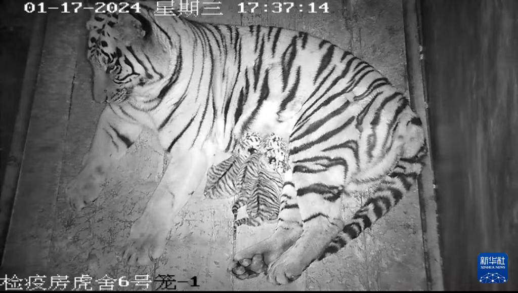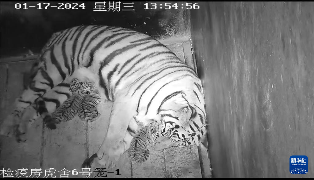 图为母虎“欢欢”和3只虎崽监控画面。(受访者供图)