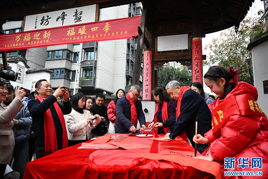 老少书法家同台挥毫泼墨,为市民写春联。新华网发(叶诚 摄)