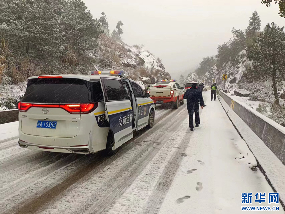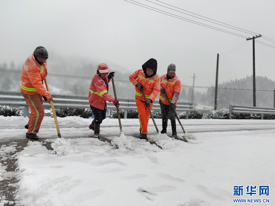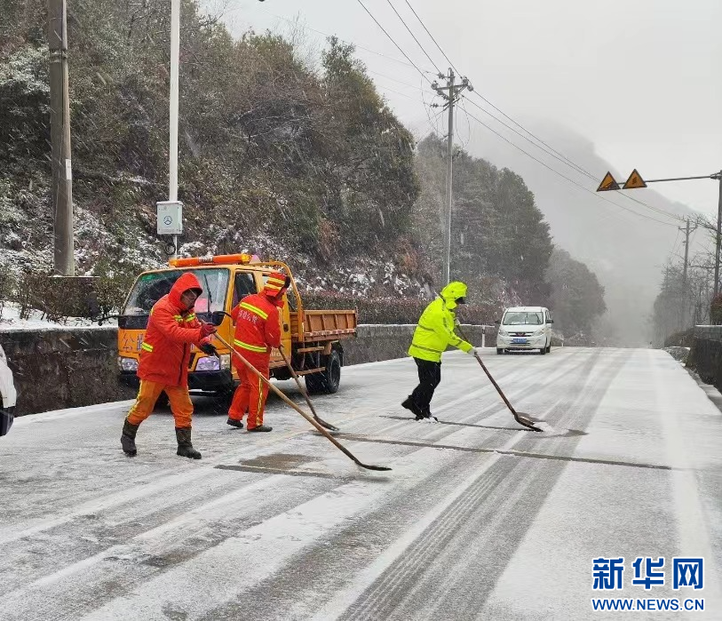 1月22日,武夷山公路分中心抢险人员在国道237武夷山分水关路段开展除雪保畅作业。新华网发(刘仕友 摄)
