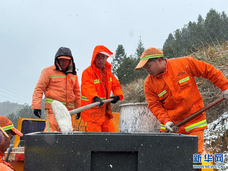 1月22日宁化养护人员撒播融雪剂,除冰融雪。新华网发(宁化公路分中心 供图)