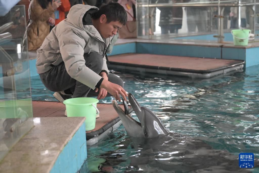 1月24日,火烧屿上的工作人员正在喂食被救助的宽吻海豚。新华社记者 林善传 摄