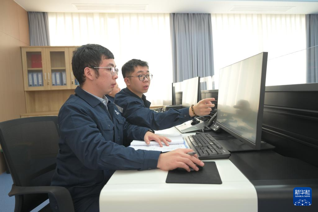 1月25日,厦门市政海上环卫站工作人员林希文(左)在海上环卫站调度中心开展保洁船舶调度工作。新华社记者 林善传 摄