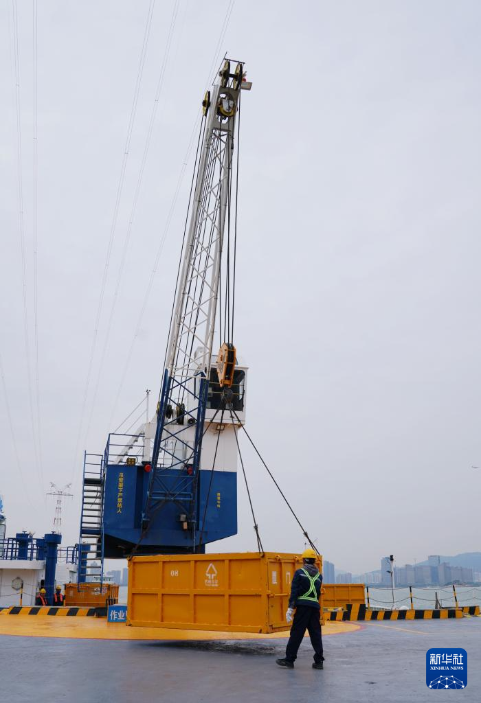 1月25日,工作人员在厦门西堤海上环卫码头吊运海漂垃圾。新华社记者 吴蓉 摄