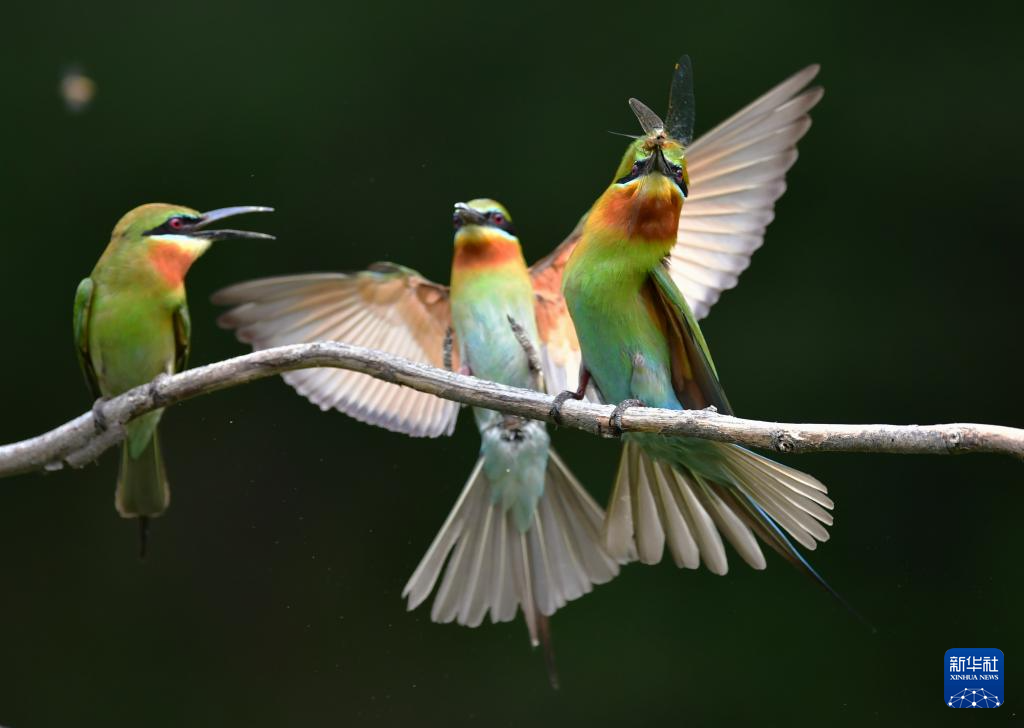 2023年5月20日,两只栗喉蜂虎在等待雄鸟(右)喂饲昆虫。新华社记者 魏培全 摄