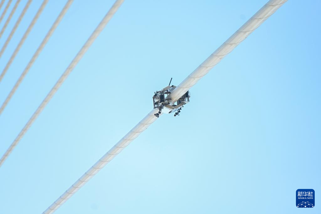 1月26日,桥梁缆索智能检测机器人对平潭海峡公铁大桥斜拉索进行检测。新华社记者 周义 摄