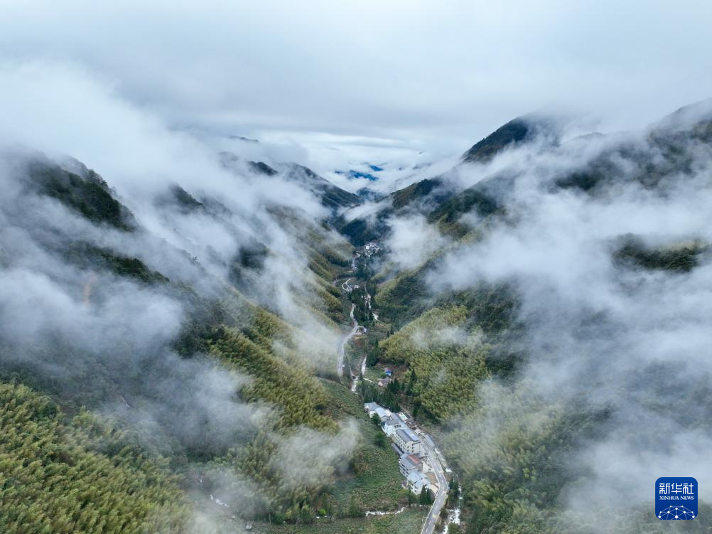 1月30日,武夷山国家公园桐木村附近云雾缭绕(无人机照片)。新华社发(邱汝泉摄)