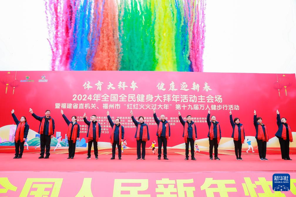 2月3日,在2024年“体育大拜年,健康迎新春”全国全民健身大拜年主会场暨福建省直机关、福州市“红红火火过大年”第十九届万人健步行活动中,嘉宾为活动打响发令枪。新华社发