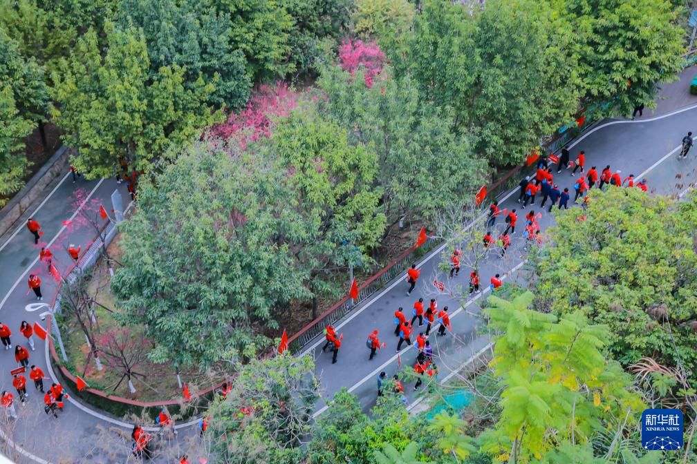 活动现场人流涌动,选手们身着红衣,从起点一路向上,绕山坡而行,远看像一条腾飞的巨龙。不少选手还在沿途各个打卡点拍照留念,留下新年祝福。