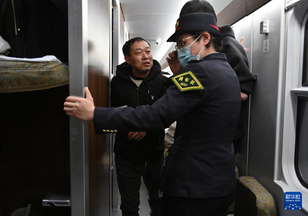 2月3日,在D59次列车上,列车长李俐含(前)刚刚调解完旅客之间的小摩擦,一名旅客上前表示赞赏。新华社记者 宋为伟 摄