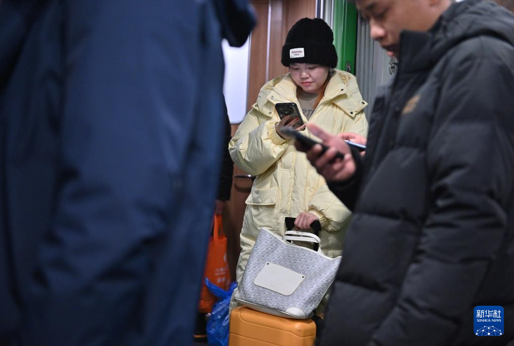 2月3日,在D59次列车上,旅客在车厢连接处看手机。新华社记者 宋为伟 摄