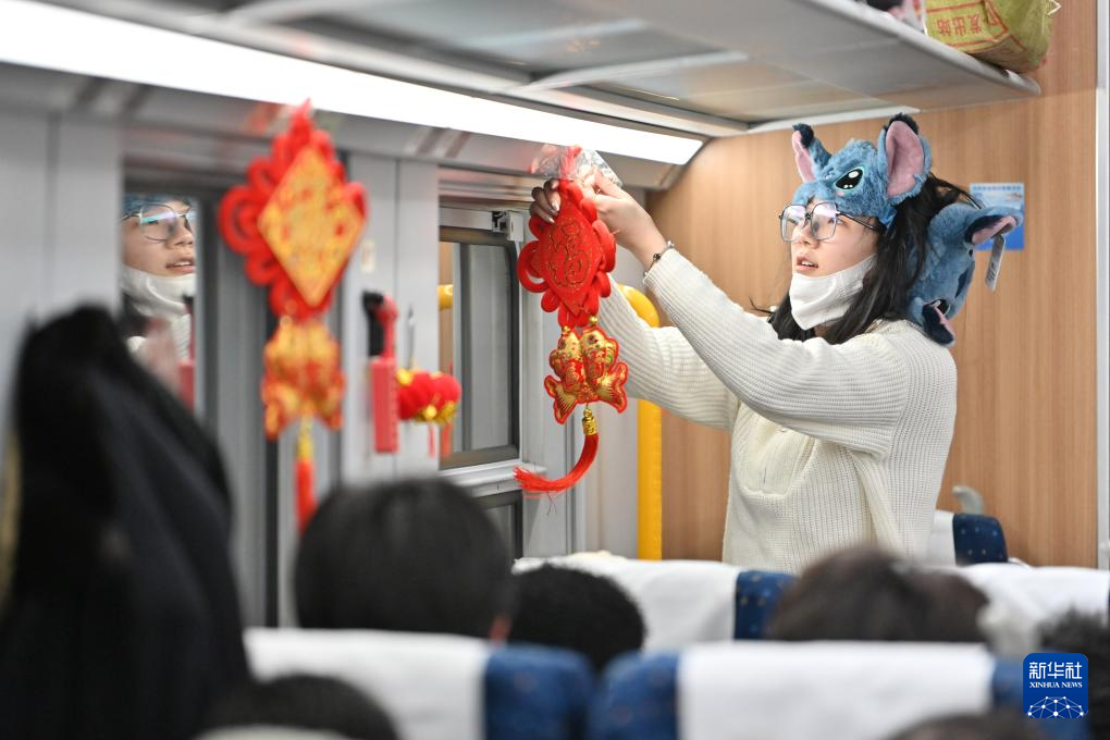 2月3日,在D59次列车上,一名小姑娘将中国结粘牢。新华社记者 宋为伟 摄