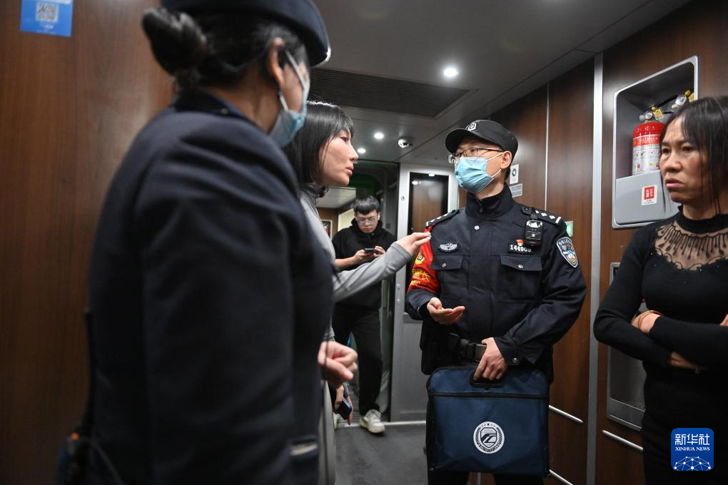 2月3日,在D59次列车上,乘警长王志阳(中)在调解旅客之间的小摩擦。新华社记者 宋为伟 摄