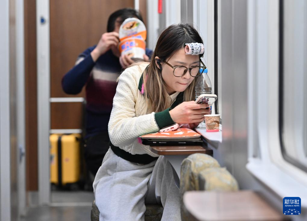 2月3日,在D59次列车上,一名头戴卷发器的女孩在看手机。新华社记者 宋为伟 摄