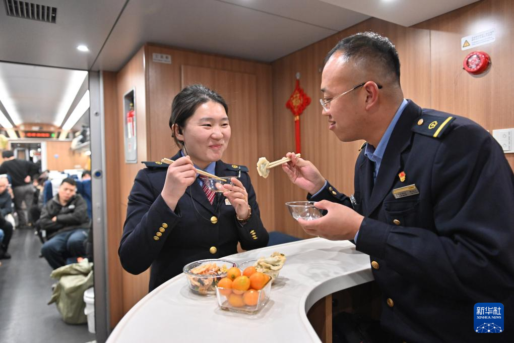 2月3日,在D59次列车上,列车员郭晓雯(左)和车辆乘务长贾连山吃饺子。这是这对新婚夫妻第一次在列车上过小年。新华社记者 宋为伟 摄