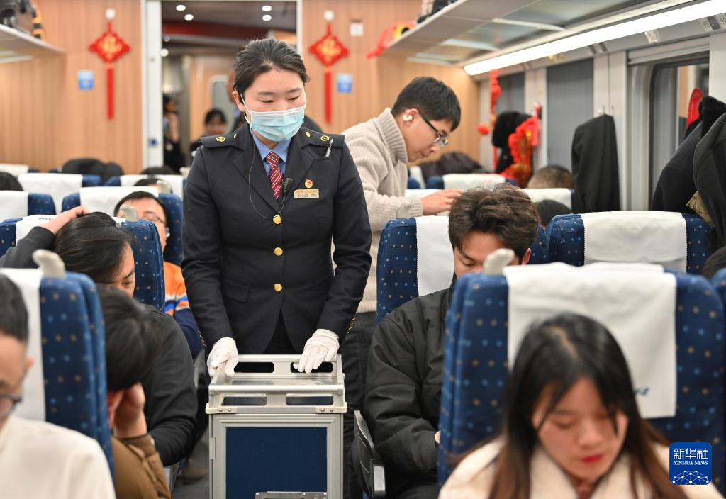 2月3日,新婚不久的列车员郭晓雯在D59次列车上为旅客服务。新华社记者 宋为伟 摄