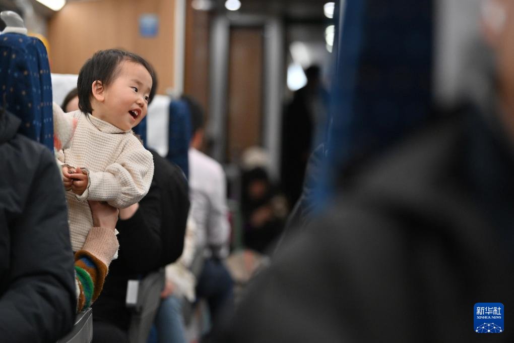 2月3日,在D59次列车上,一名随父母去福州看望外婆的孩子在玩耍。新华社记者 宋为伟 摄