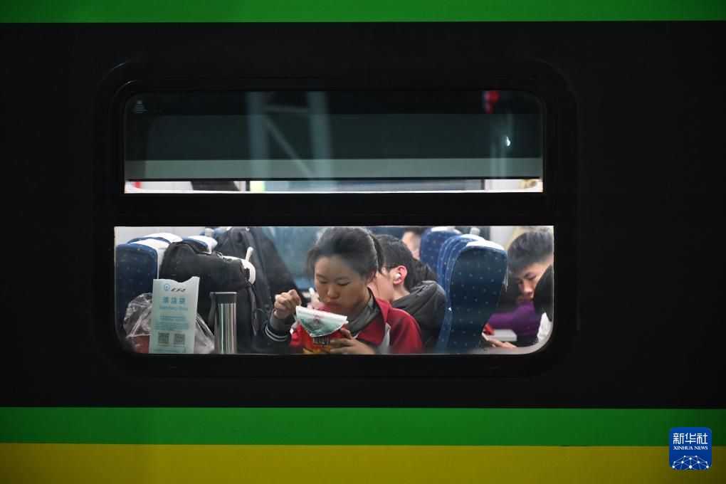 2月3日,D59次列车停靠聊城站期间,一名乘客在吃泡面。新华社记者 宋为伟 摄