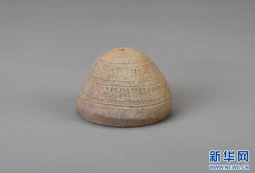 西汉划花水波纹灰陶纺轮,1985年汉城遗址出土,饰数道双弦纹,间饰似水波纹,中心有一小洞贯通上下。 新华网发(福建博物院供图)