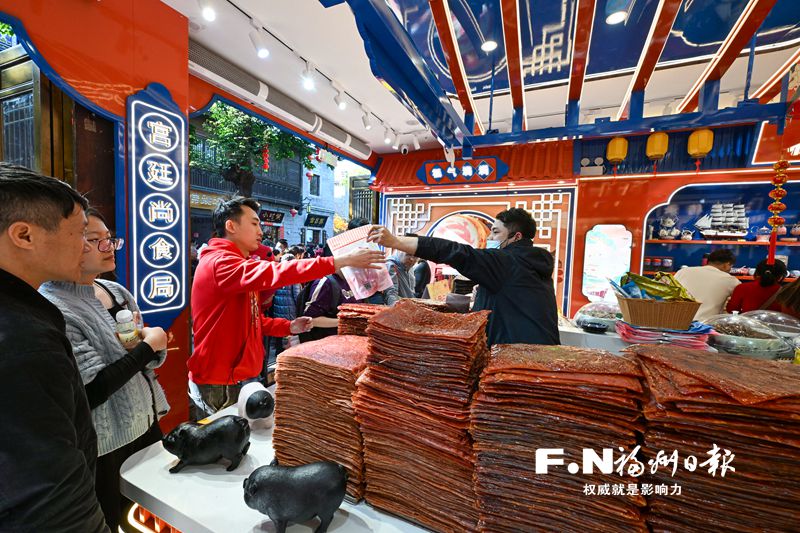 服装店对面,老字号百饼园内也十分热闹。“今年我们推出‘五福临门’‘福气满满’几种礼盒,里面有小麻花、红年糕、芋头糕、红纸包、芝麻酥等传统点心,很适合作为伴手礼。”营业员说,外地游客比较喜欢这样的包装,送人体面又能代表福州特色,大年初一以来,每日销量都是平时的五六倍。