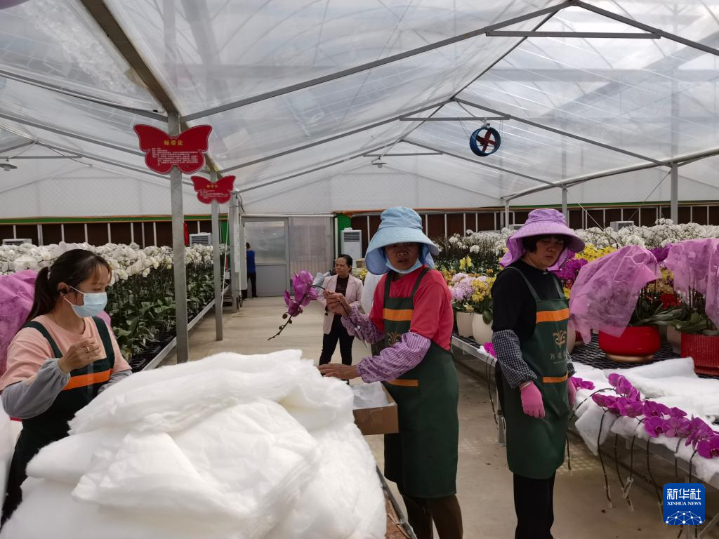 龙潭镇村民在蝴蝶兰基地打包鲜切花。新华社记者 秦宏 摄