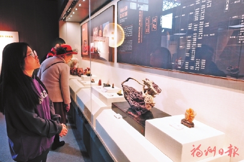 国家级非物质文化遗产寿山石雕展区,也吸引了不少人驻足欣赏。只见展台上摆放着虾蛄、牡蛎等由寿山石雕刻而成的美食,看起来栩栩如生,似乎香味都快要溢出玻璃展柜。“太诱人了!”从东北来到福州的游客郭女士赞叹道,“这让我更想深入地了解福州,看看是什么样的城市能够孕育出这样的文化。”