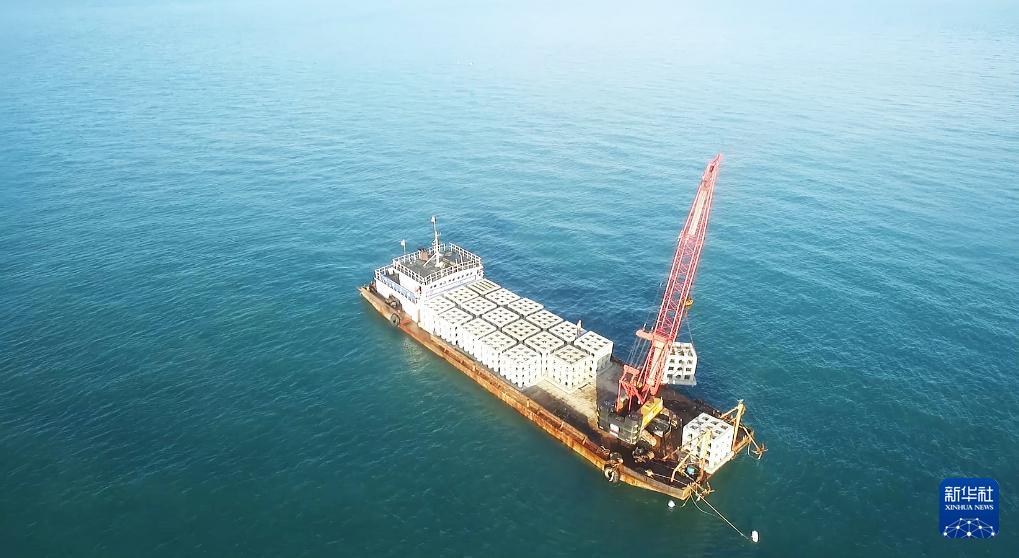近日,记者在人工鱼礁投放现场看到,一艘巨大的运输工程船满载上百块正方体礁体,船上的吊臂像抓娃娃机一般陆续将它们放入水中。礁体入海后,船员会下水检查礁体是否平稳,如有倾斜吊臂就会继续调整释放位置。