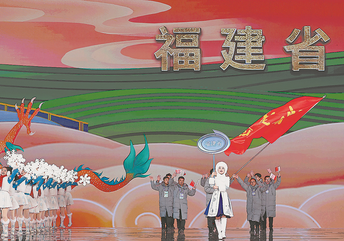 2月17日,第十四届全国冬季运动会开幕式在内蒙古呼伦贝尔市海拉尔区内蒙古冰上运动训练中心举行。图为福建省体育代表团在开幕式上入场。李博 摄