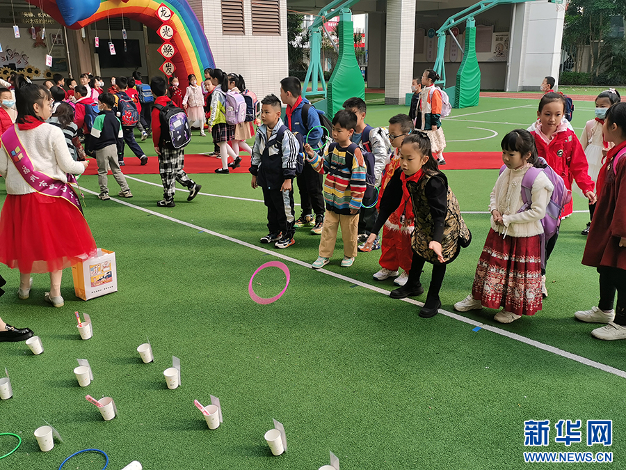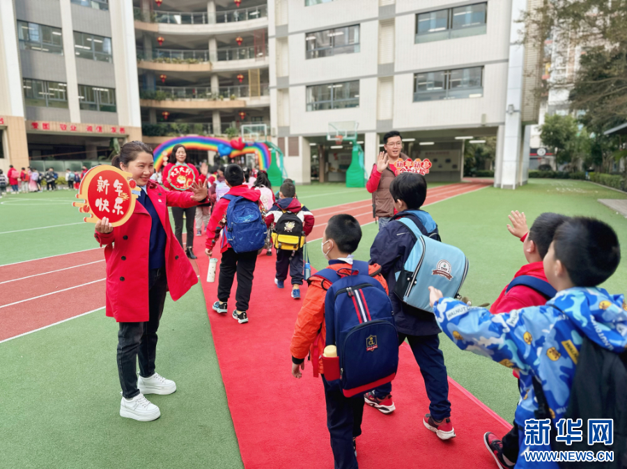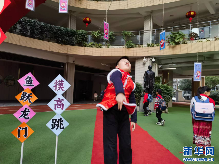 新华网福州2月19日电(蒋巧玲)春风如约至,龙年启新程。2月19日,福州市中山小学的孩子们走过红毯,跃上“龙”门,重新欢聚在校园。为了迎接春季开学,学校安排了摸高跳、套圈圈、猜灯谜、班级寻龙等一系列趣味活动,让孩子们在欢乐喜气的氛围中进入新学期。