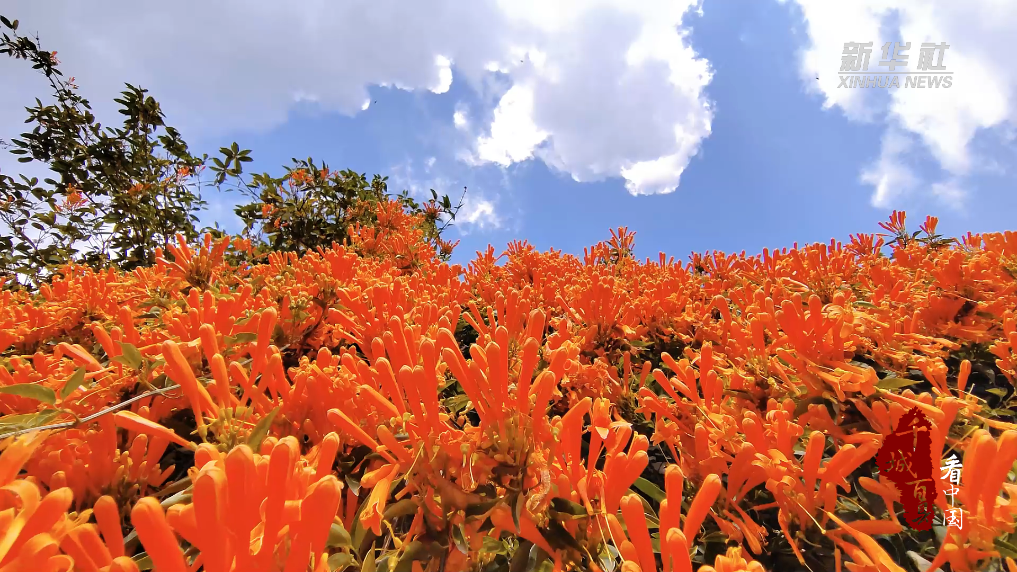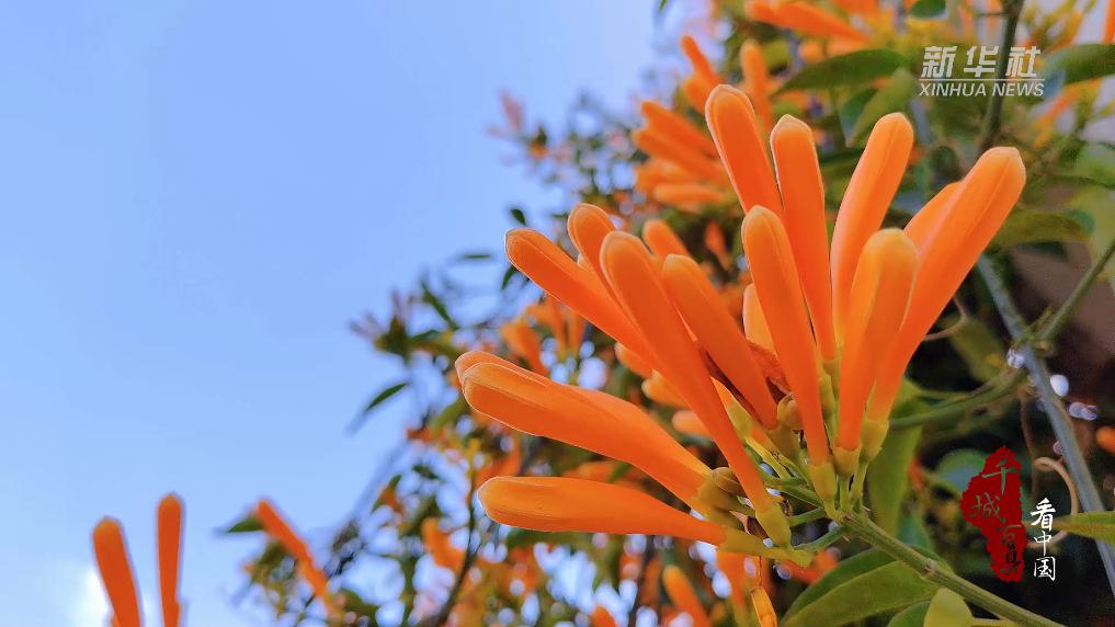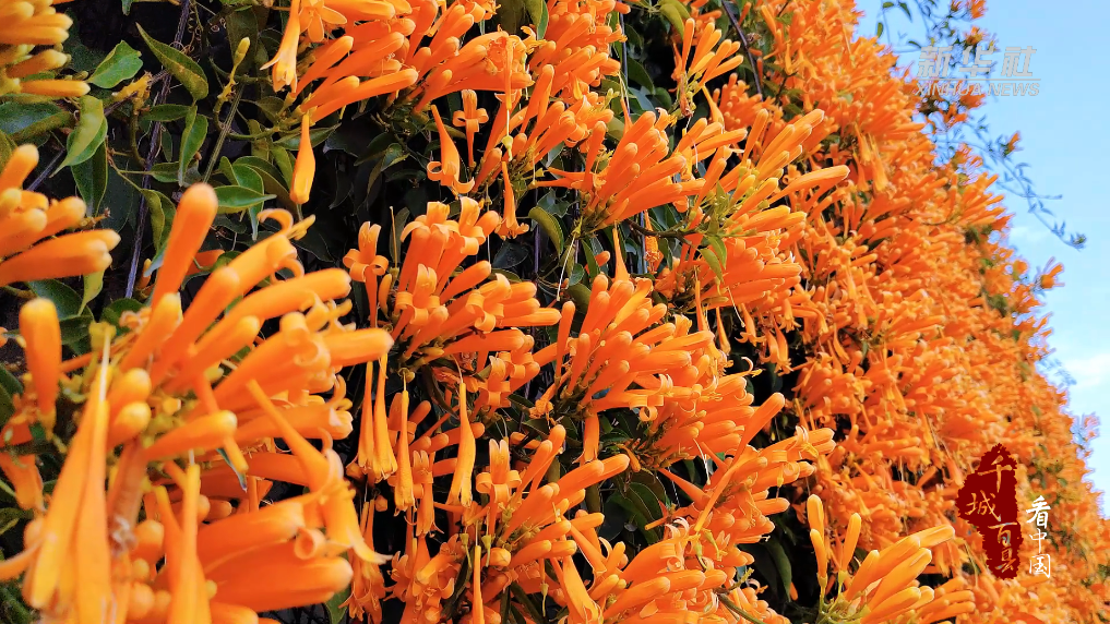 近日,在福建省泉州市德化县的街道、院墙、小巷,“报春信使”炮仗花正热烈绽放。放眼望去,一串串橙红色的炮仗花如瀑布般倾泻而下,气势十足地盛放,展现着龙年新气象。