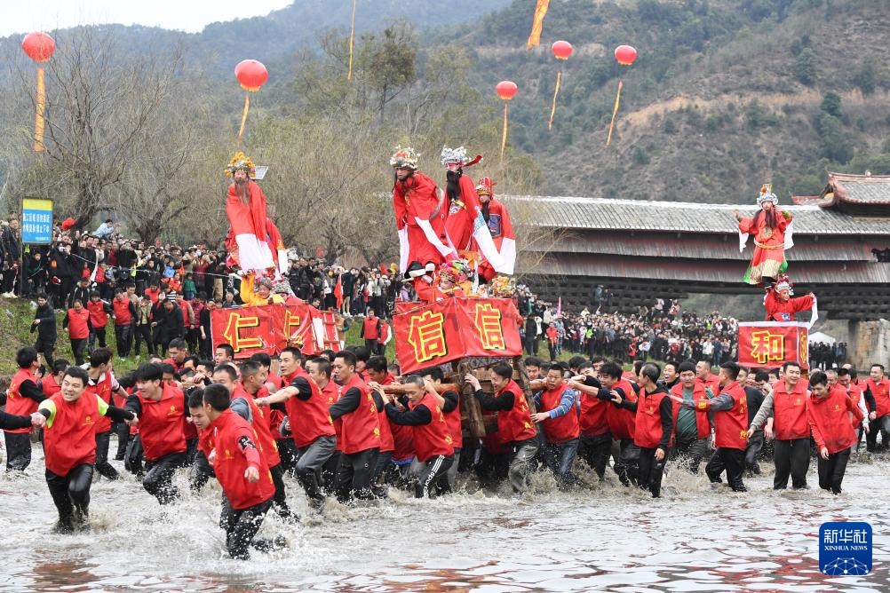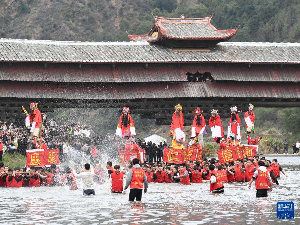 2月24日,福建省连城县罗坊乡走古事队伍穿过云龙廊桥,蹚着清岩河水前行。新华社记者 姜克红 摄