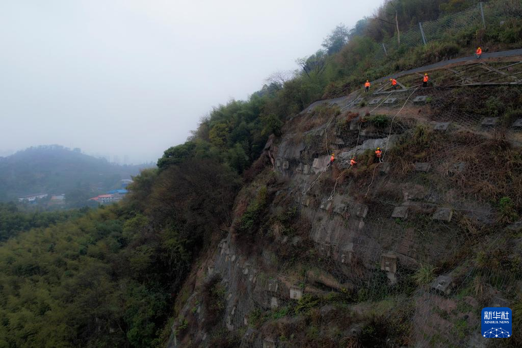 在峭壁上,隔着王俊两三米远的郑玉骞一边攀爬,一边举着锤头对山石敲击。南方冬季湿冷,深山里寒气更甚,郑玉骞口中呼出的气凝结在睫毛和发梢上,每爬几下就会腾出手来擦把汗。山体壁坡长满杂草,时不时出现的倒刺给高空作业带来不小挑战。“每次敲击检查以20厘米为间距,每块石头敲三下,通过敲击声的清脆和沉闷,就能判断是否出现松动隐患。”郑玉骞说。