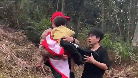 搜救人员抱起蜷缩在杂草丛中的女孩后