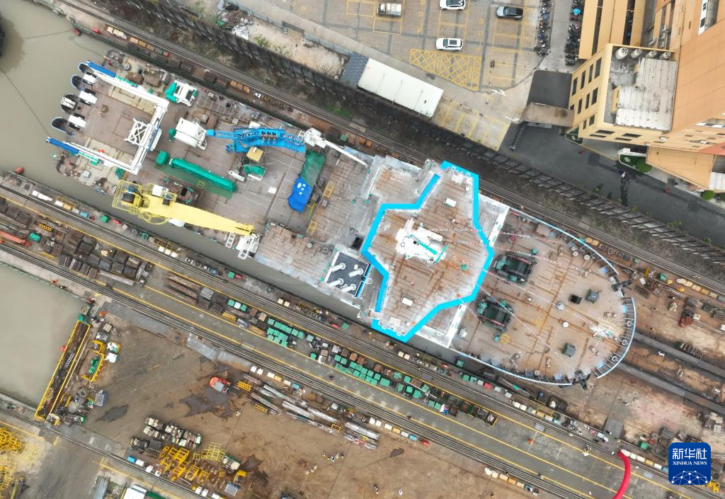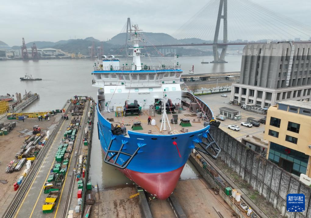 2月29日,海上风电多功能运维母船“M913-1”船在福州马尾的一处船坞准备下水(无人机照片)。新华社记者 林善传 摄