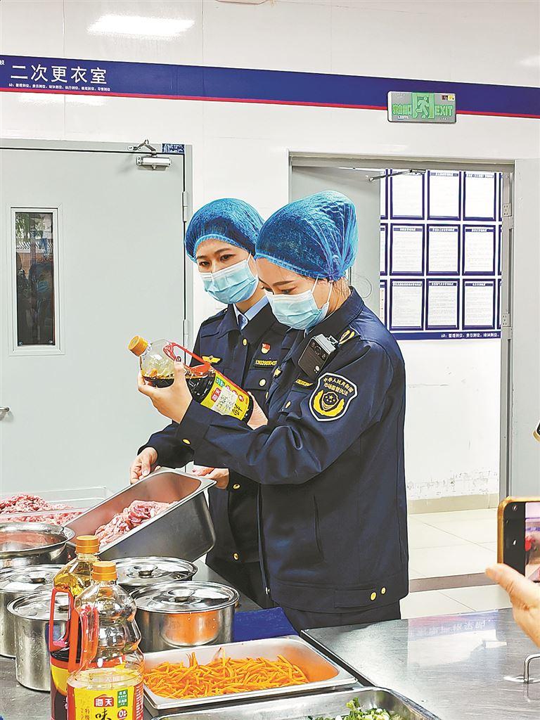 湖里区市场监管局检查学校食堂食材和调味品。