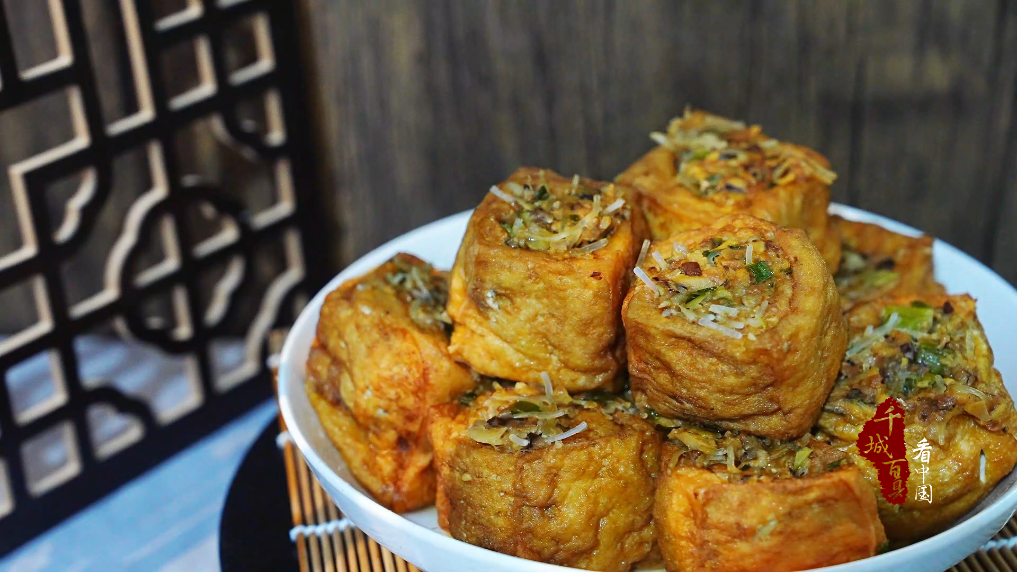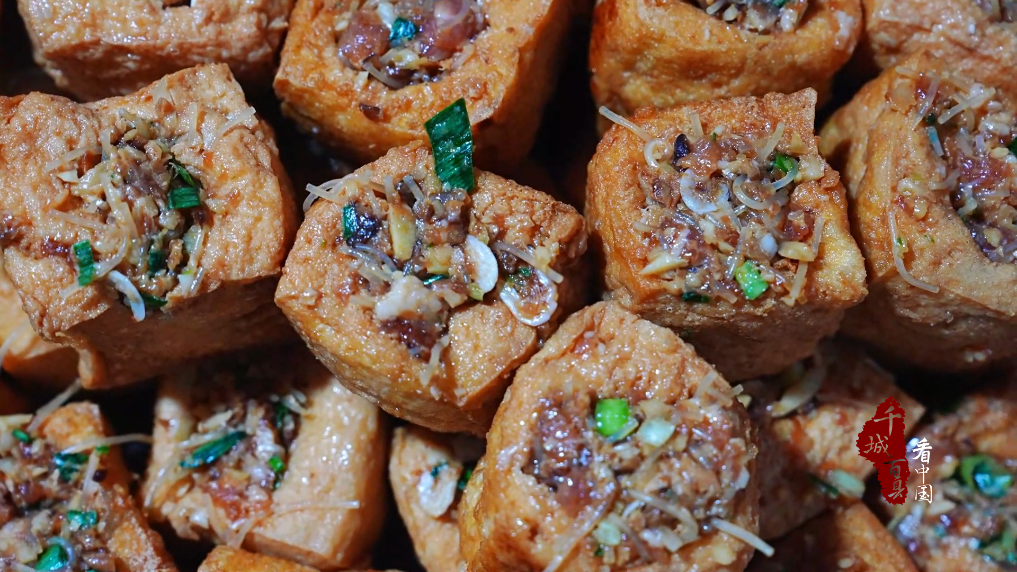 灌豆腐的馅料也非常丰富,一般有猪肉、冬笋、香菇、粉丝等,将豆腐块小火慢炸至金黄,冷却后就可以开始“灌”豆腐了。把豆腐表皮划开一个小口,从小口将馅料塞入。豆腐灌好后,在锅中蒸20分钟以上,即可出锅。