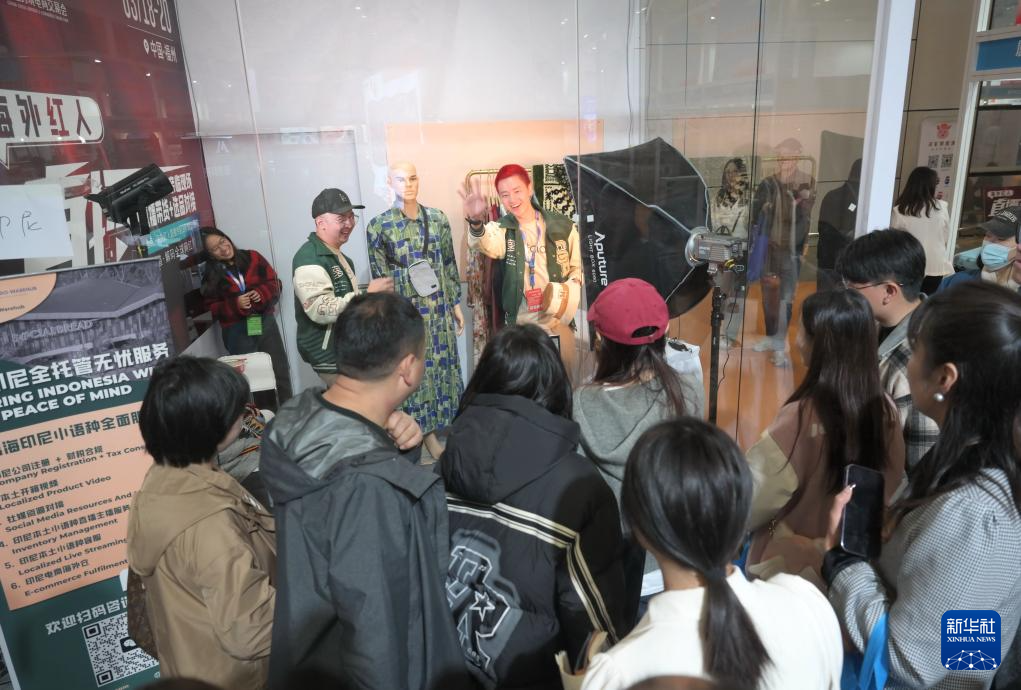 3月18日,参观者在海外红人直播专区观看印尼网红直播带货。新华社记者 林善传 摄