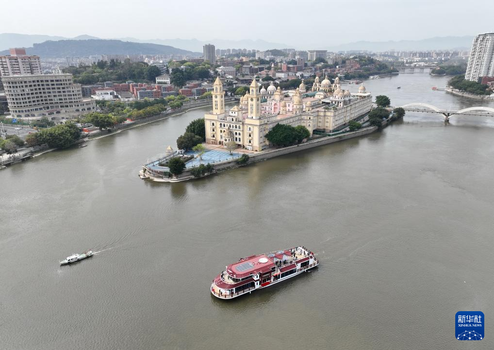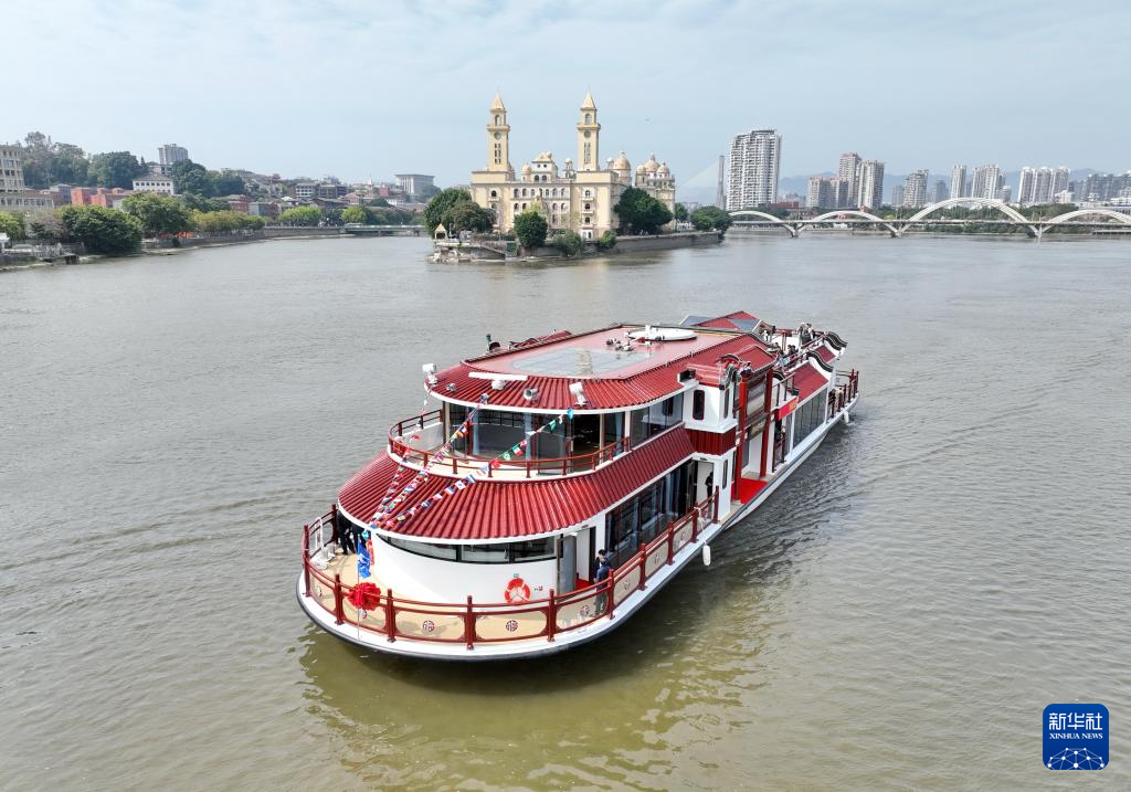 3月21日,“闽江会客厅”纯电动客船在闽江行驶(无人机照片)。新华社记者 林善传 摄