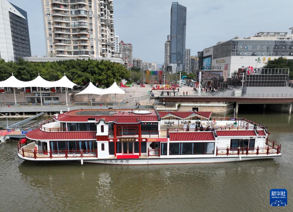 3月21日,“闽江会客厅”纯电动客船停靠在闽江游台江码头(无人机照片)。新华社记者 林善传 摄