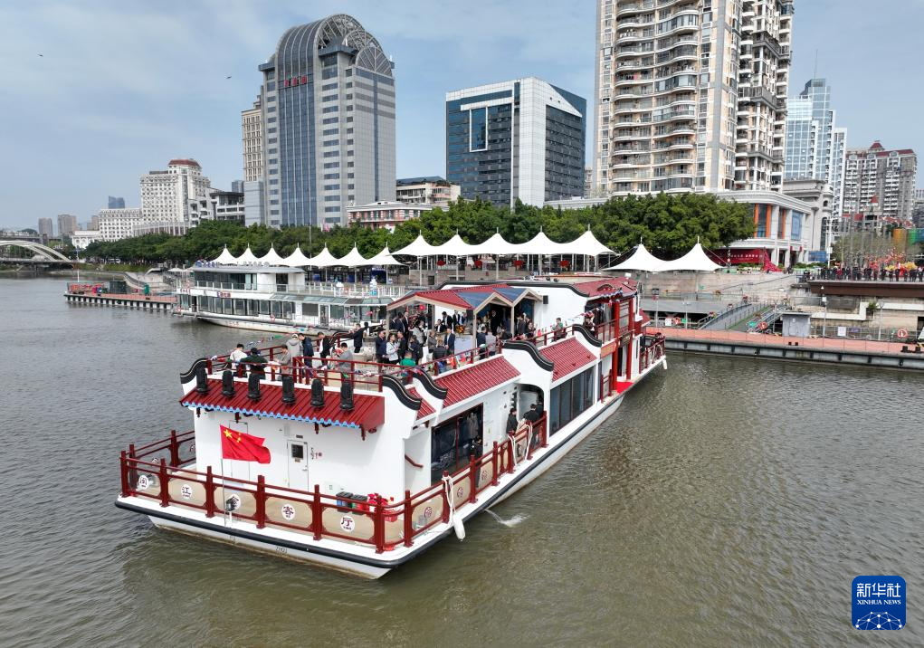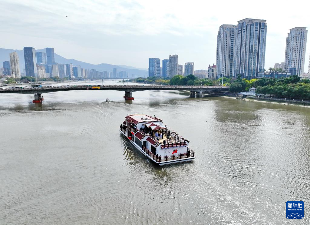 3月21日,“闽江会客厅”纯电动客船离开闽江游台江码头(无人机照片)。新华社记者 林善传 摄
