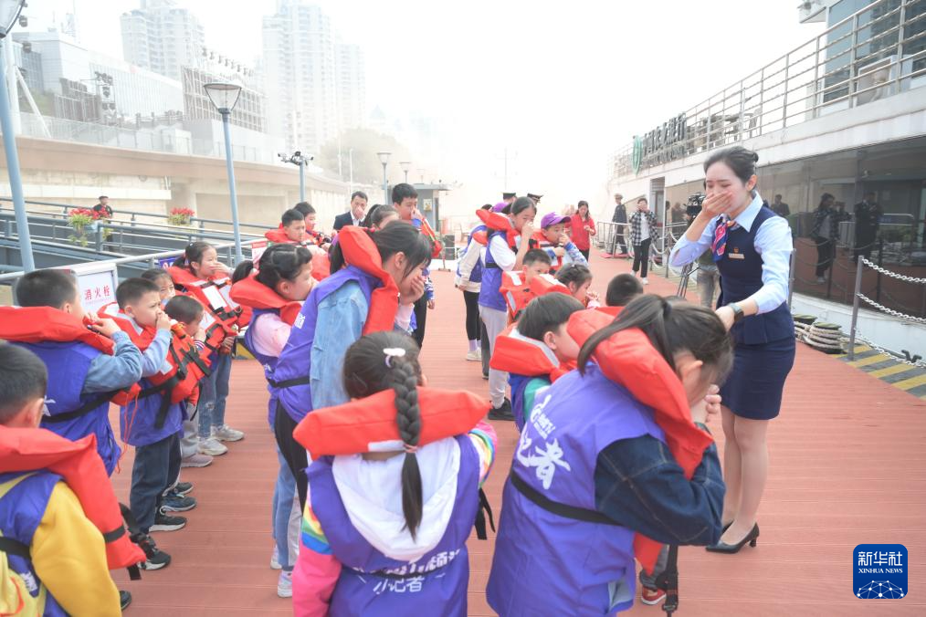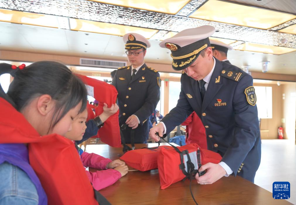 3月24日,福州海事局工作人员在“闽江之恋”号客轮上教学生穿戴救生衣。新华社记者 林善传 摄
