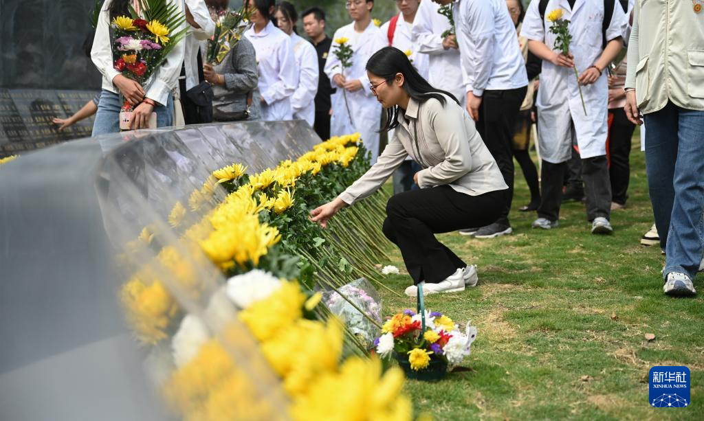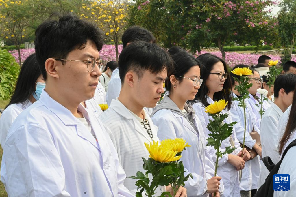 3月29日,在海沧文圃山厦门市遗体和器官捐献者纪念园,医学专业院校学生代表手捧鲜花缅怀逝者。新华社记者 周义 摄
