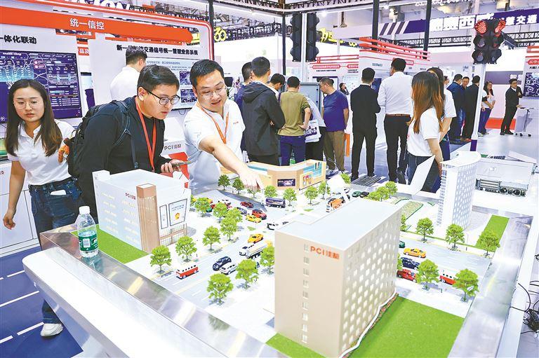 在佳都科技展台,现场工作人员向记者介绍城市交通管理等应用案例。