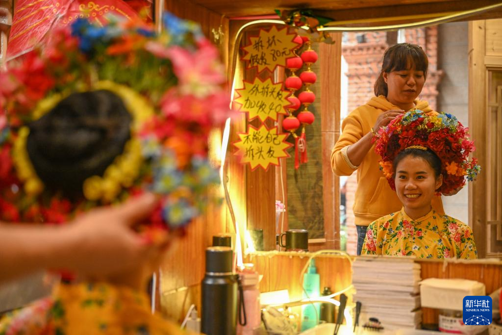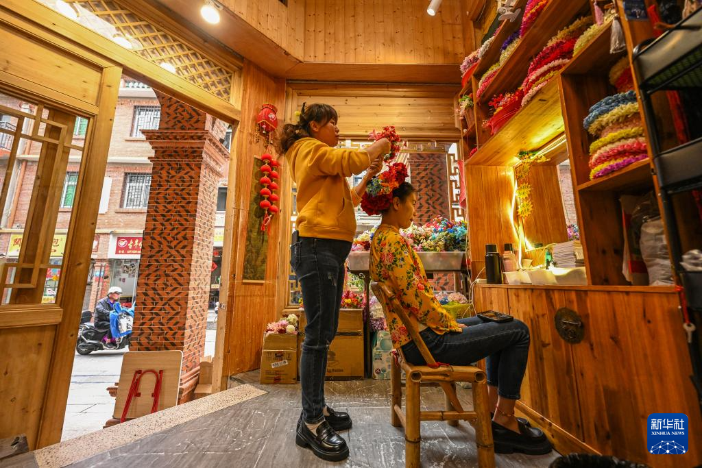 4月10日,在泉州中山路的一家蟳埔女簪花围体验店,老板为游客簪花。蟳埔女簪发戴花的古老民俗被称为“簪花围”。2023年初,网络上掀起“簪花围”热潮,各地游客慕名前来体验。新华社记者 周义 摄
