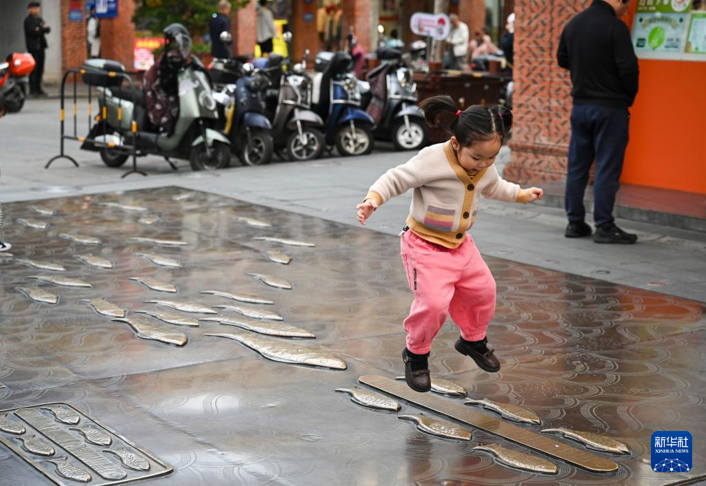 4月10日,在泉州中山路,一名小女孩在金鱼巷玩耍。新华社记者 周义 摄