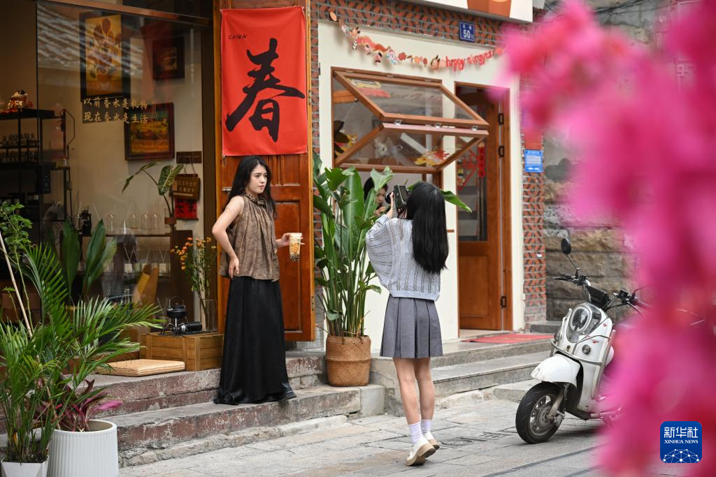 4月10日,游客在泉州中山路的一家香氛用品店前打卡、拍照。新华社记者 周义 摄