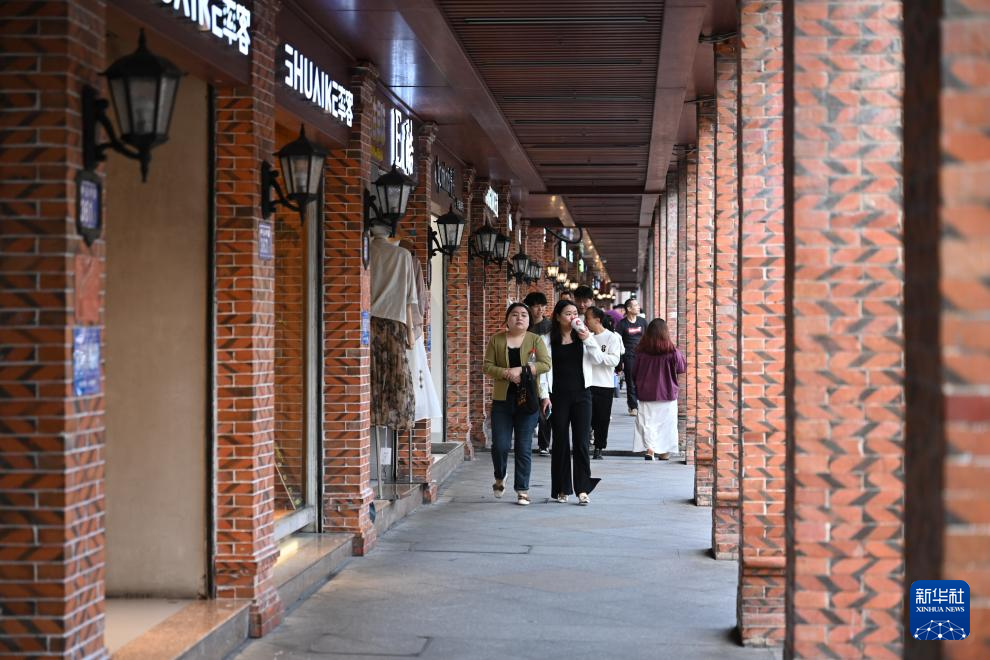 4月10日,游客在泉州中山路连排式骑楼下的廊道内逛街。新华社记者 周义 摄